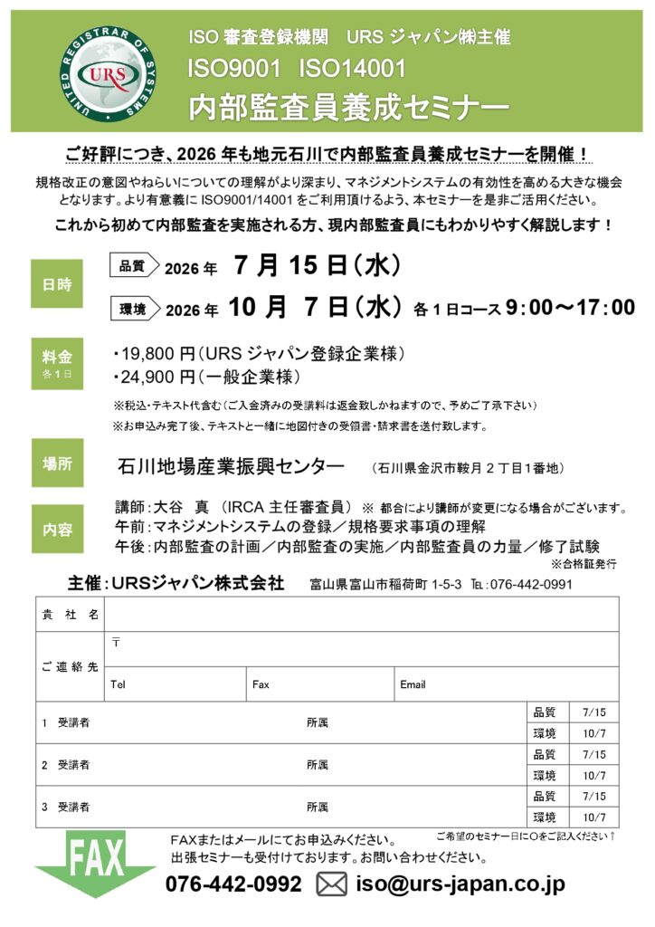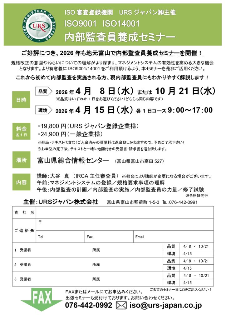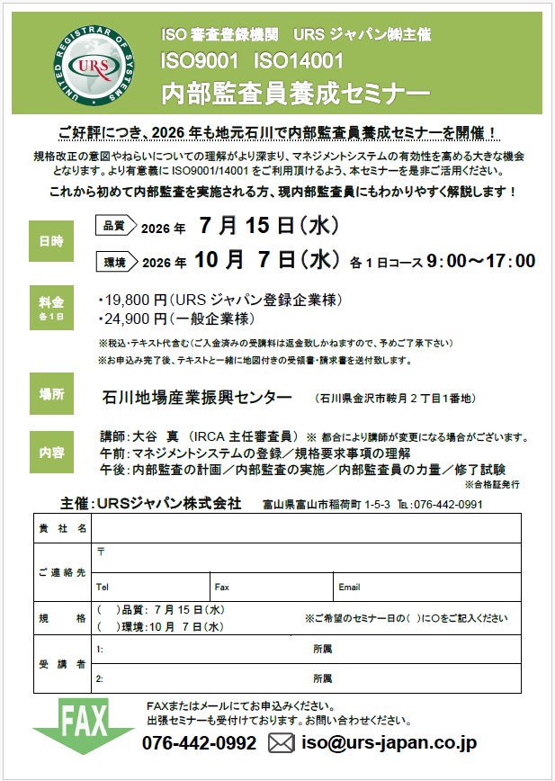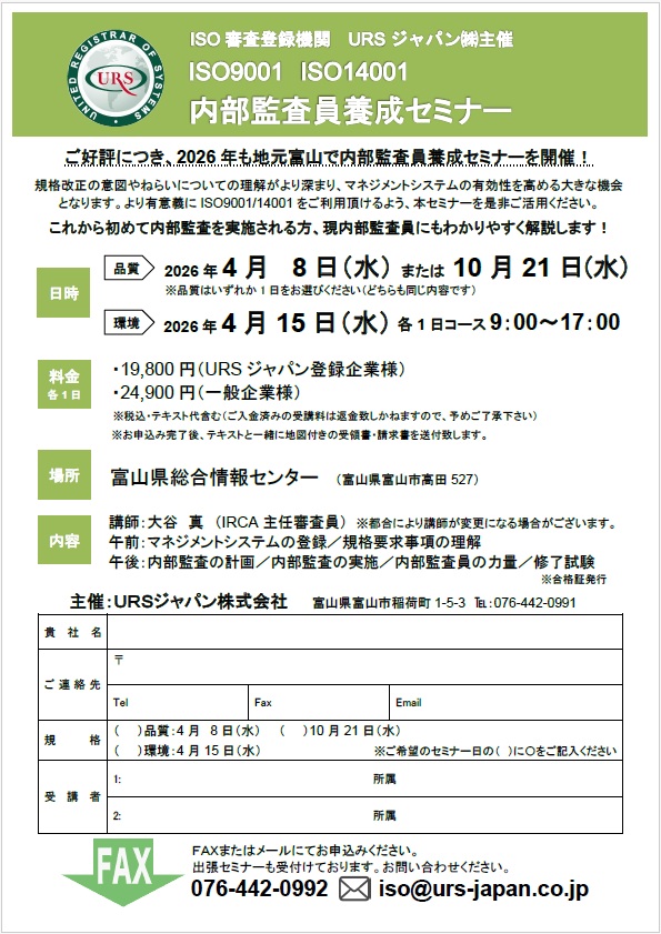 2026年度【富山】ISO14001 内部監査員養成セミナー