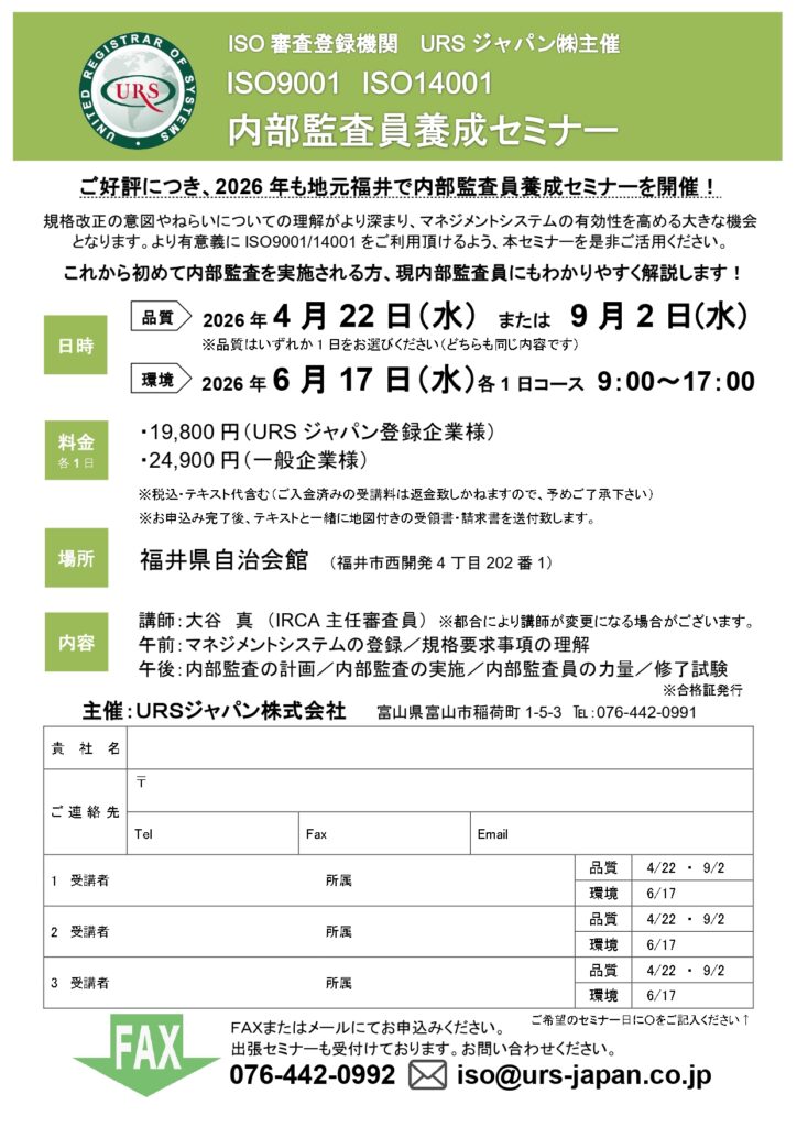 2026年度【福井】ISO14001 内部監査員養成セミナー